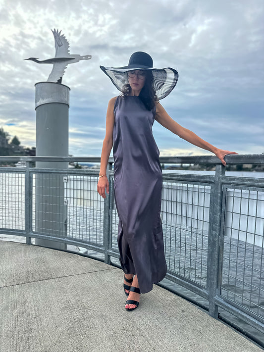 Elegant Metallic Purple Taupe Full-length Silk Dress