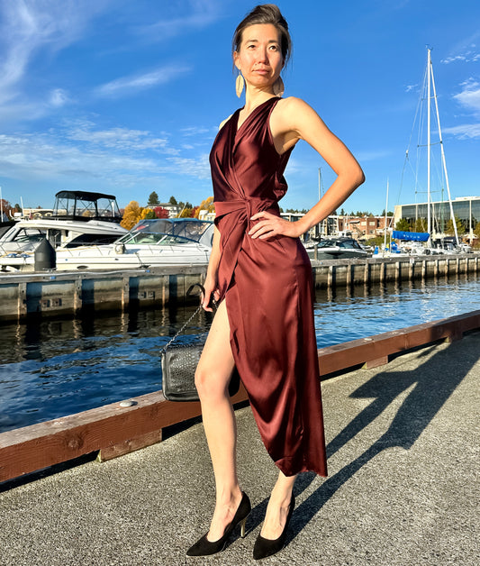 100% Silk Wrap Dress with High Side Slit Burgundy