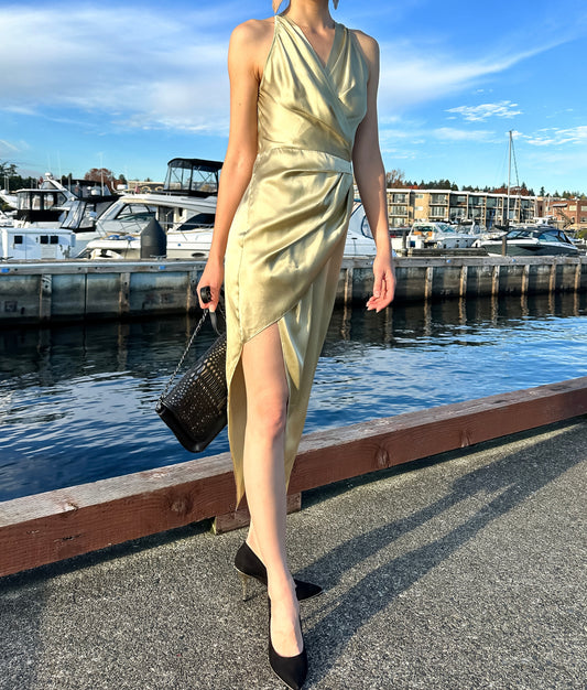 Modern Wrap Silk Dress with High Side Slit Olive-Champagne