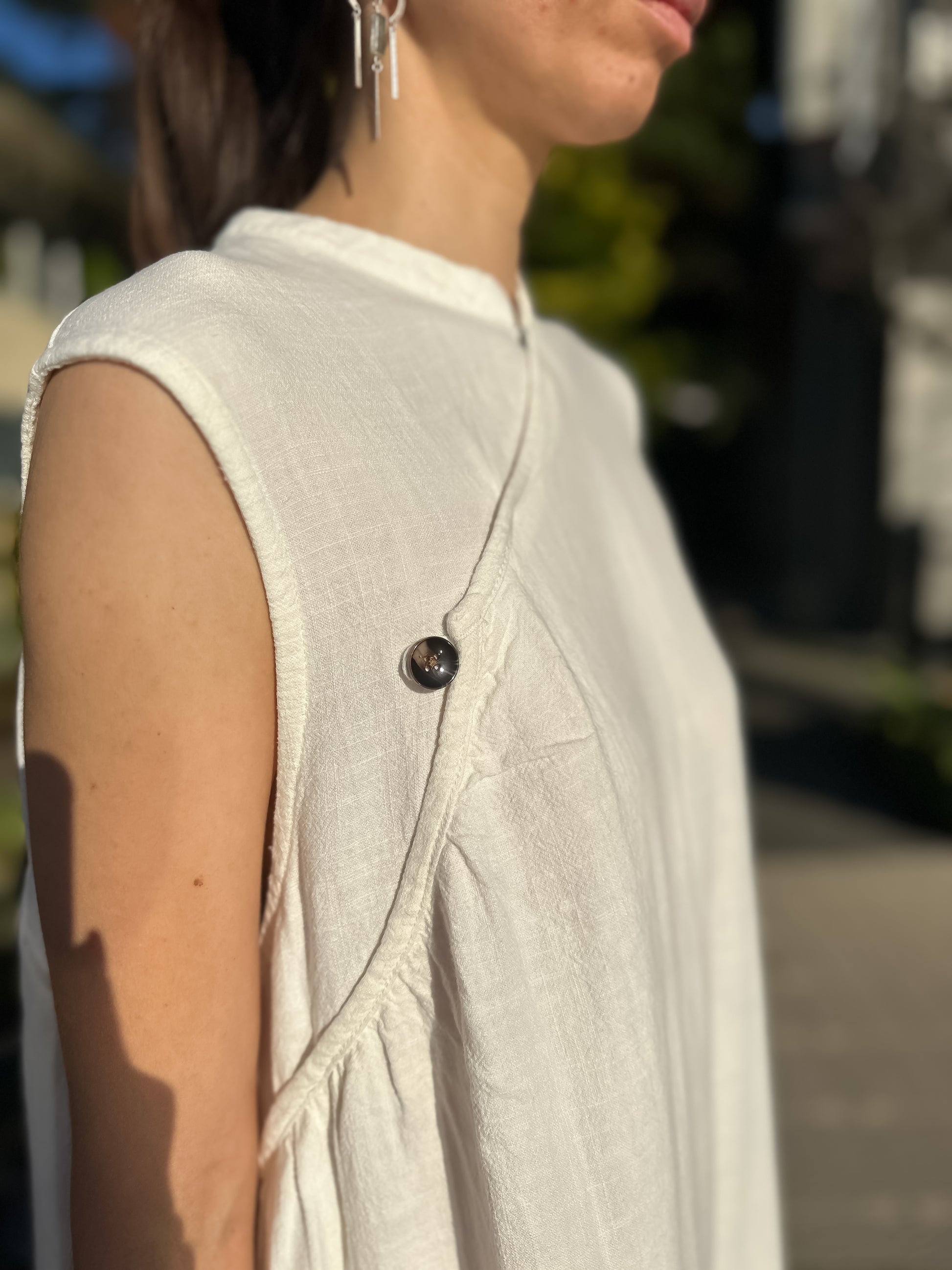 This elegant oriental style midi-length dress is crafted from a breathable blend of cotton and ramie, making it both lightweight and durable with a soft, natural texture. Designed for effortless style and comfort, it features a sleeveless silhouette with a high neckline and an asymmetrical button detail for a modern touch.